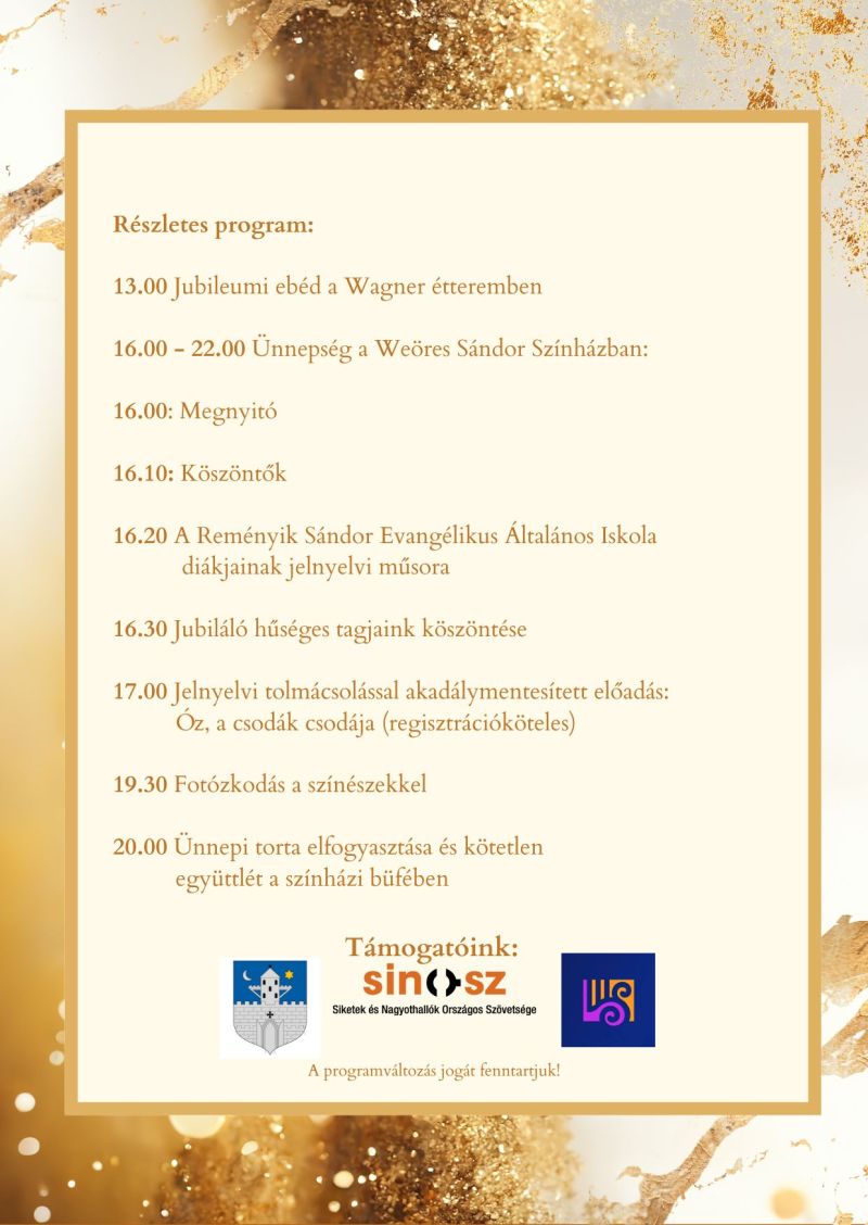 Régi álmunk válik valóra, és egyben a társadalmi felelősségvállalás és a szemléletformálás kiváló alkalma kínálkozik Vas vármegye első akadálymentes színházi előadásának bemutatóján, mely jubileumi rendezvényünk csúcspontja lesz. A Weöres Sándor Színházban Leitner Viktória jelnyelvi tolmácsolásával tekinthetik meg tagjaink és minden jelnyelv iránt érdeklődő vendég az Óz, a csodák csodája című látványos musicalelőadást.