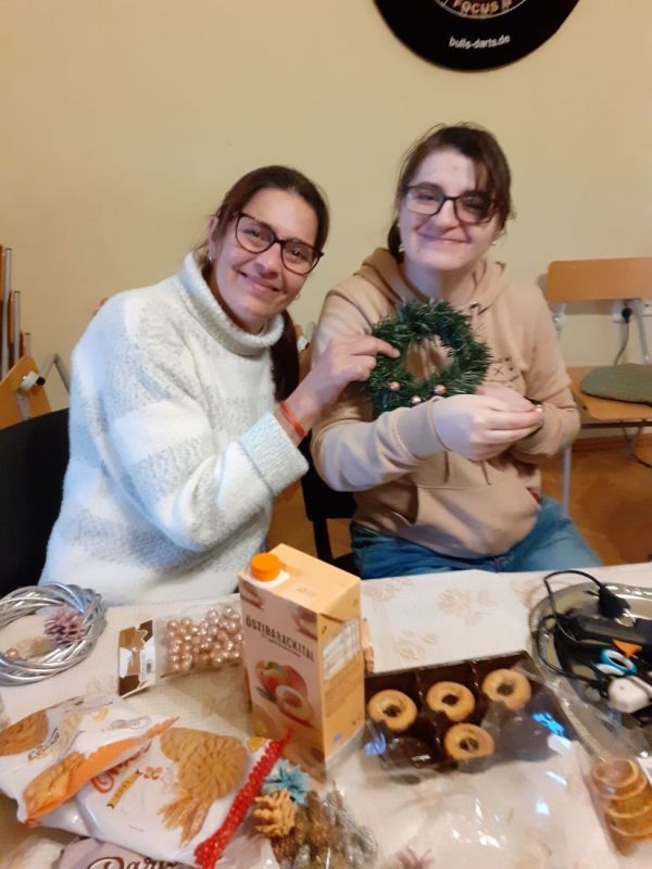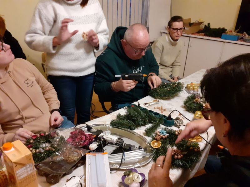 Ezt követően adventi koszorúkat készítettünk. A hozott sütiket eszegetve, egymást segítve, lelkesen valósítottuk meg elképzeléseinket. Az alkotás folyamán volt, aki a terméseket részesítette előnyben, volt, aki a csillogó dekorációs anyagokat, de a végeredménnyel minden résztvevő elégedett volt.