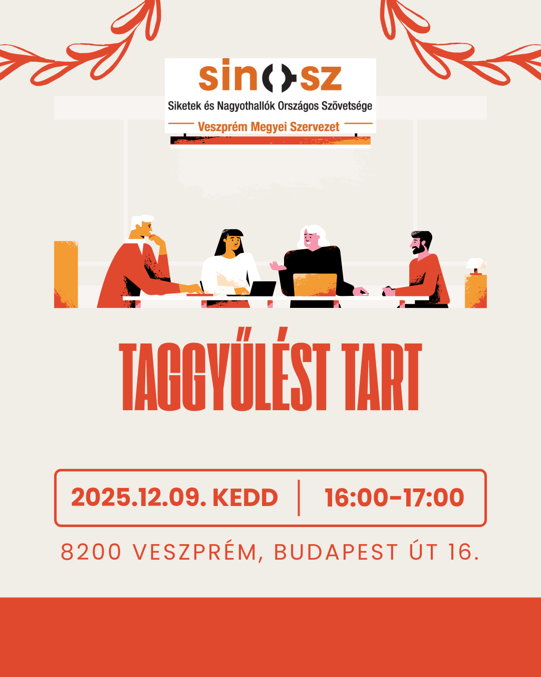 Az Alapszabály 69.2/ és 69.3./ pontjaira hivatkozva ezúton értesítjük, hogy amennyiben a taggyűlés a fent meghirdetett időpontban és helyszínen nem határozatképes, azaz nem éri el a jelen lévő tagok száma a szervezetünk taglétszámának több mint 50%-át, abban az esetben ismételt taggyűlést hívok össze, melynek helye: SINOSZ Veszprém Vármegyei Szervezete, cím: 8200 Veszprém, Budapest út 16.; időpontja: 2025. december 9., 16 óra 10 perc. A megismételt taggyűlés az eredeti napirendi pontok vonatkozásában a megjelentek számára tekintet nélkül határozatképes lesz.