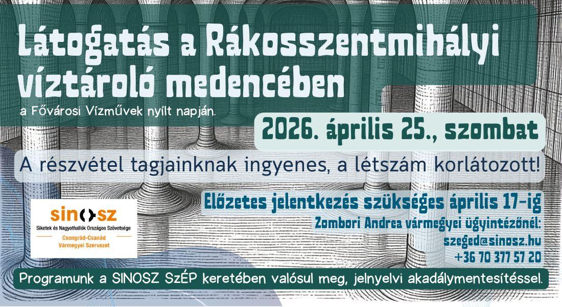 A SINOSZ Csongrád-Csanád Vármegyei Szervezete különleges programra várja tagjait a Föld napja alkalmából: a Fővárosi Vízművek első alkalommal biztosít lehetőséget arra, hogy látogatók sétálhassanak a Rákosszentmihályi víztároló medence oszlopsorai között. Ha voltál velünk a Gruber József víztároló medencénél, kívülről láthattad a jellegzetes oszlopokat. Ha most velünk tartasz, egy rövid ismertető után együtt sétálhatunk az üres medencében.