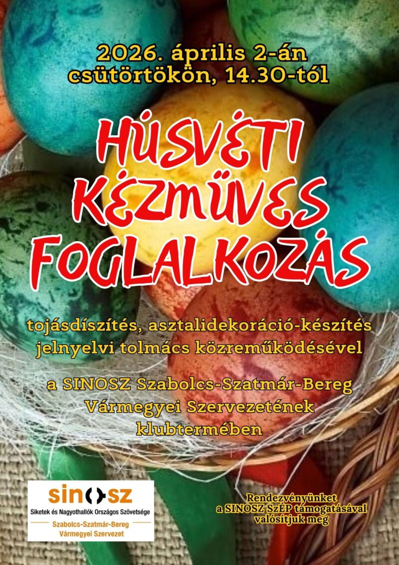 Jelnyelvi tolmács segítségével idézzük fel a húsvéti ünnepkörhöz tartozó népszokásokat és hagyományokat, majd tojásokat díszítünk, és asztali dekorációkat készítünk, melyekhez az alapanyagokat és eszközöket mi biztosítjuk.