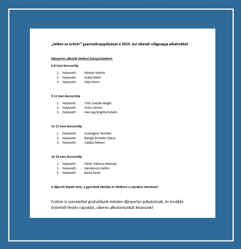 A gyermekrajzpályázatra 86 darab értékelhető pályamű érkezett*: az ország 5 siketiskolája és a Dr. Török Béla EGYMI, továbbá 3 többségi oktatási intézmény nevezett be alkotásokat több korcsoportban, emellett egyéni pályázók is küldtek rajzokat, köztük integráltan tanuló hallássérült és halló gyerekek is, ill. a SINOSZ nyári Vidám7 napközis táborában is készültek rajzok e célra.