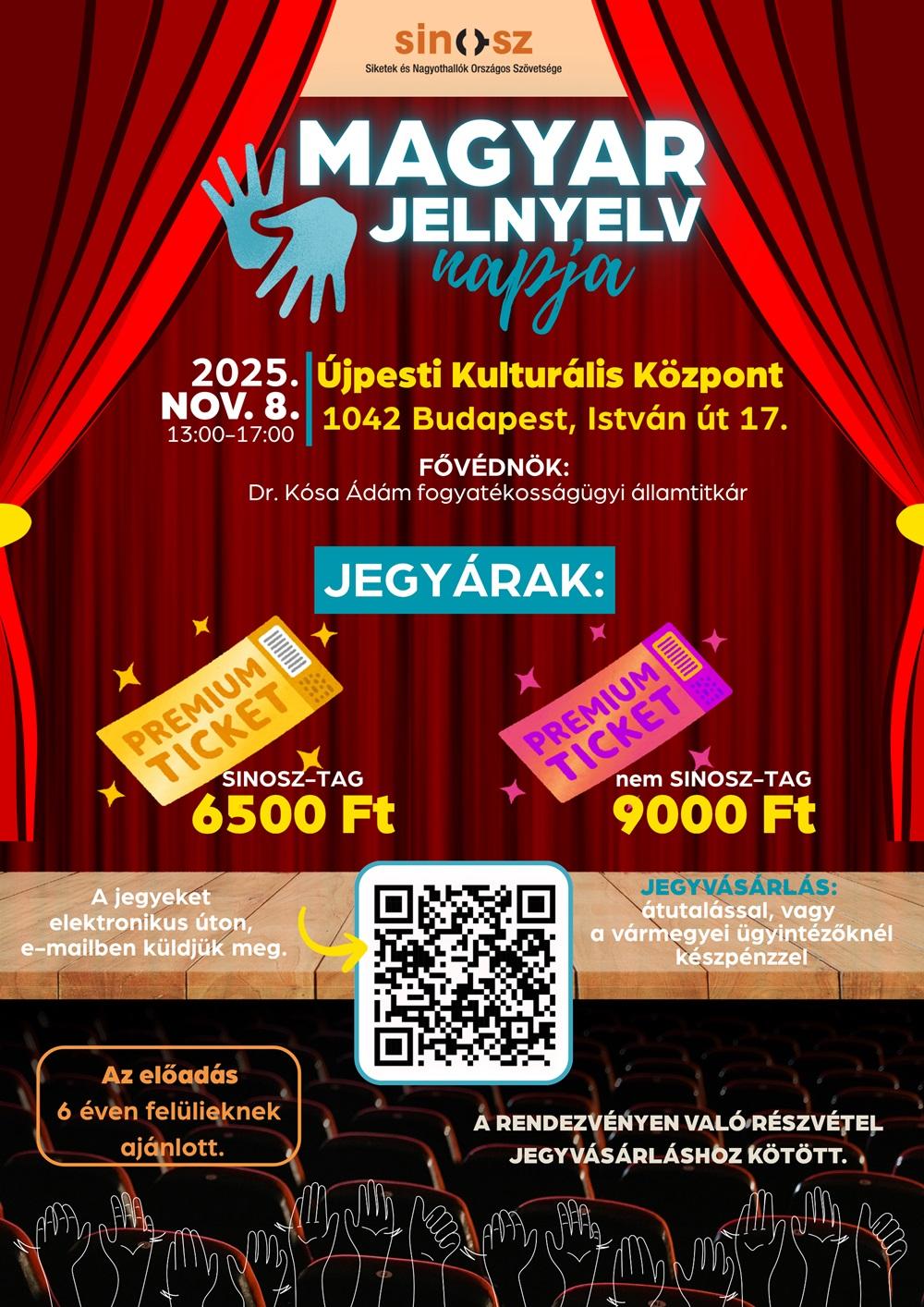 1) Regisztráció a https://befizetes.sinosz.hu/jegyek/jelnyelv-napja-2025 oldalon, amely az alábbi QR-kóddal is elérhető:
