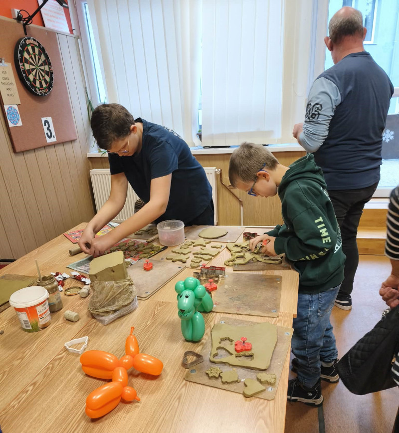 A délután folyamán lehetőség volt kézműves foglalkozáson részt venni Köpör István vezetésével, ahol agyagból készíthettek karácsonyi díszeket. Sok szép és egyedi alkotás született. Emellett csillámtetoválás is készült, a gyerekek nagy örömére.