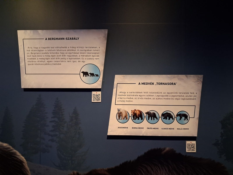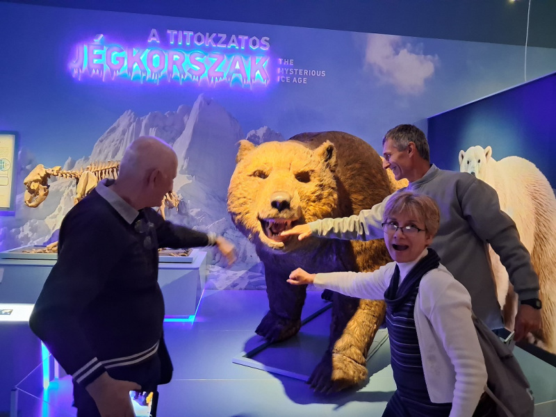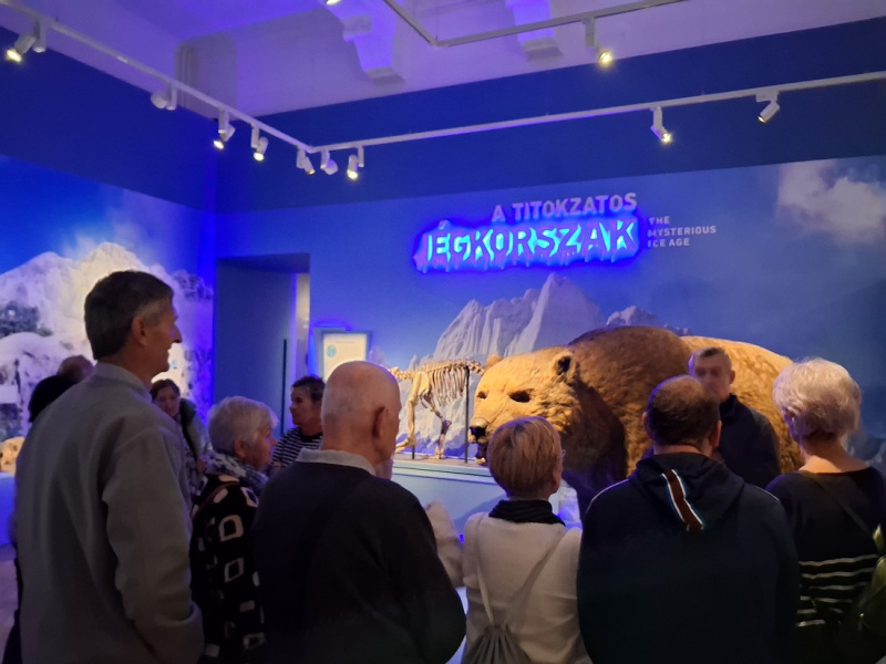 Látogatásunk napján is osztályok, más csoportok járták be a kiállítótereket, rugalmasan alkalmazkodtunk a különleges korszak felfedezésében a lehetőségekhez, ezért az éppen legkevésbé látogatott, a mozgó, hangot adó, élethű állatok termében kezdtük – az állatok mozgásérzékelővel reagáltak a látogatók megjelenésére, elsőként a teljesen élethű barlangi oroszlán ijesztette meg csoportunkat, ahogy váratlanul fenyegetően megmozdult, mikor mellé érkeztünk. Mindegyik állat mellett rövid információs táblán láthattuk a testméretét, mekkora az emberhez képest, melyik földrészeken volt megtalálható. Ebben a teremben azt is megtudtuk, hogy miért is voltak sokkal nagyobbak az extrém hidegben az állatok, testük, fejük, fülük, orruk formája, mérete mind az életben maradás esélyét növelte. A Bergmann-szabály ma is felfedezhető: a közeli rokonságban álló fajok példányai közül a hidegebb égövön nagyobb méretűek, a mérsékelt égövi példányok kisebbek, a melegebb területen élők a legkisebbek. Ez a szabály nem minden csoportra igaz, de pl. a medvék esetén jól láthattuk a kiállítótérben. Idegenvezetőnkkel megnéztük a jellegzetességeket, azt is, minek milyen szerepe van, miért vannak a méretbeli, testalkatbeli különbségek (pl. kisebb fül, kevesebb hőveszteség).